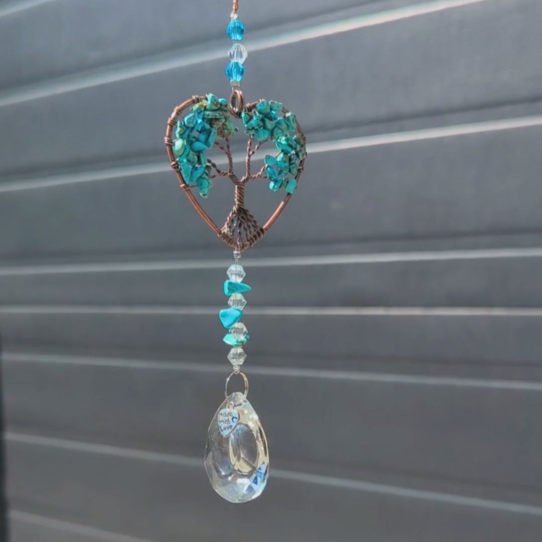 AS06 | Capteur de soleil cœur cuivre avec pendentif cristal et arbre de vie turquoise