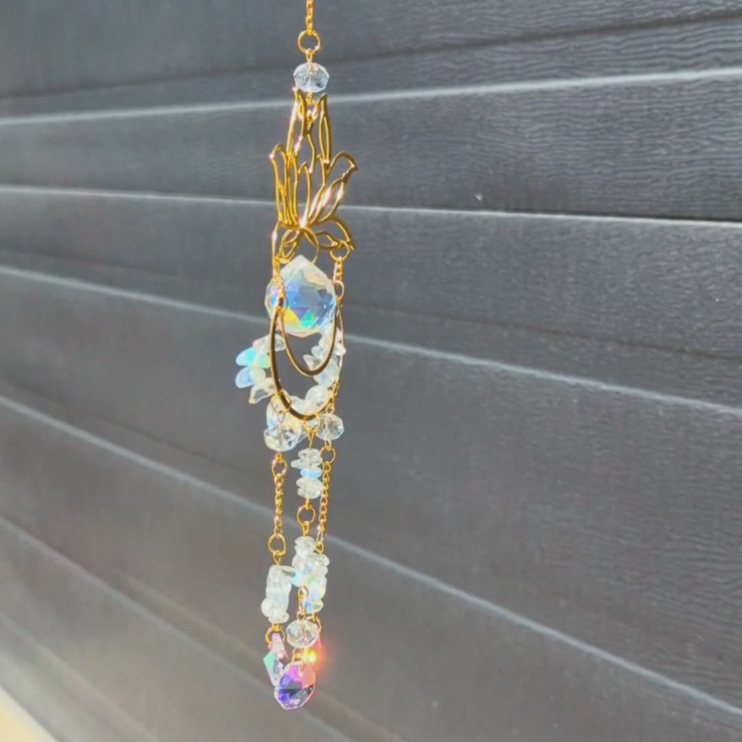 Ce capteur de soleil (aussi appelé attrape-soleil) à suspendre fait environ 36,5 cm de long. Il est fait de pièces de laiton doré incluant un lotus et une lune, d'une boule et de pièces en verre cristal, avec des pépites de cristal de roche.